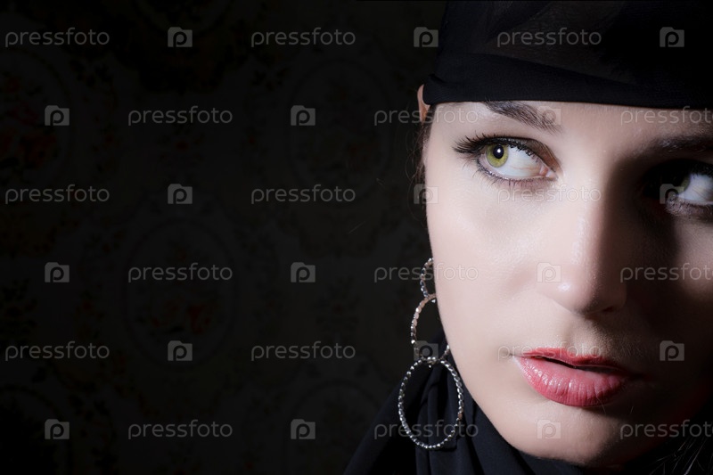 Сексуальная девушка с темными волосами и зелеными глазами на темном фоне