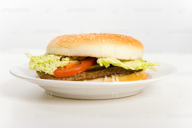 Аппетитный гамбургер лежит на белой тарелке