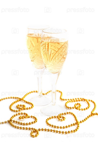 Два бокала шампанского и бусы в виде сердец на белом фоне