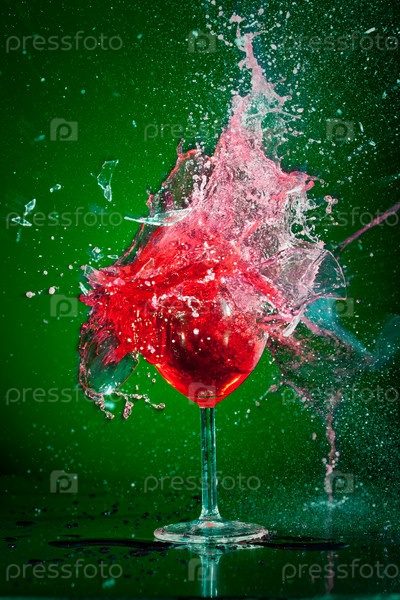 Разбивающийся бокал с красным вином на зеленом фоне