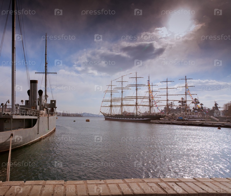 Парусные корабли у пристани на фоне облачного неба