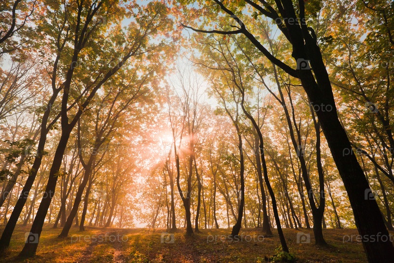 Солнечные лучи пробиваются сквозь деревья в осеннем лесу
