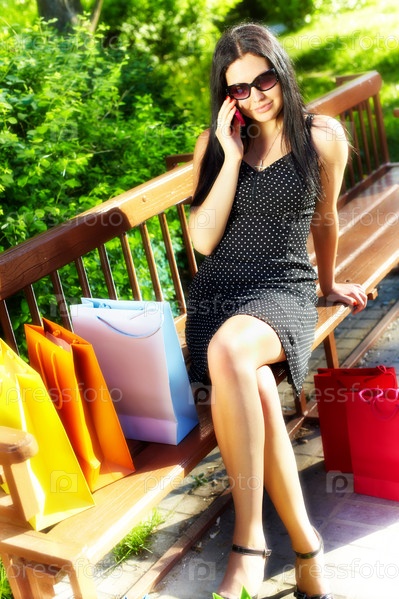 Молодая брюнетка с бумажными пакетами сидит на скамейке