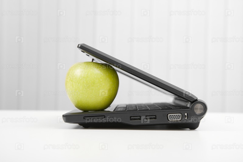 Черный ноутбук и зеленое яблоко