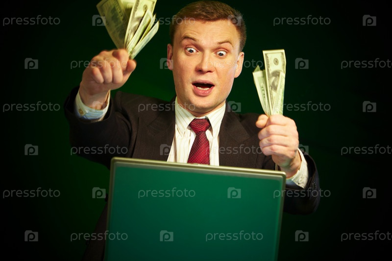 Мужчина с деньгами в руках у монитора