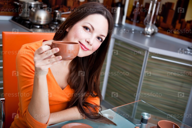 Молодая женщина на кухне пьет чай