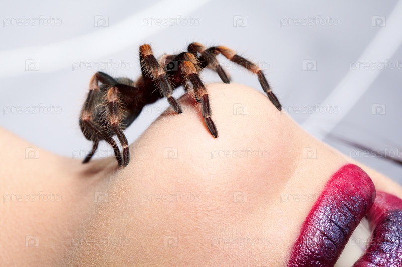 Паук на подбородке девушки, крупный план