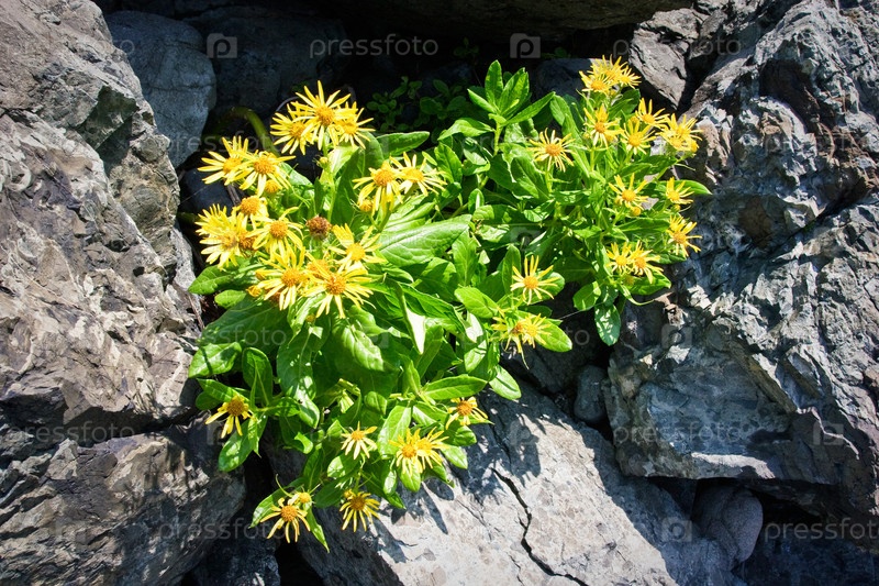 Желтые цветы растут среди камней