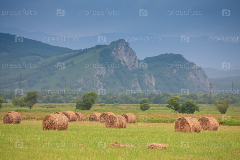 Аккуратные стога сена в поле на фоне гор