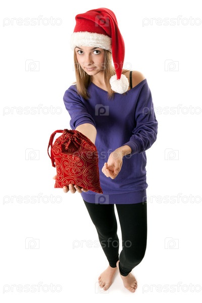 Красивая девушка в красной новогодней шапке с подарком в руке