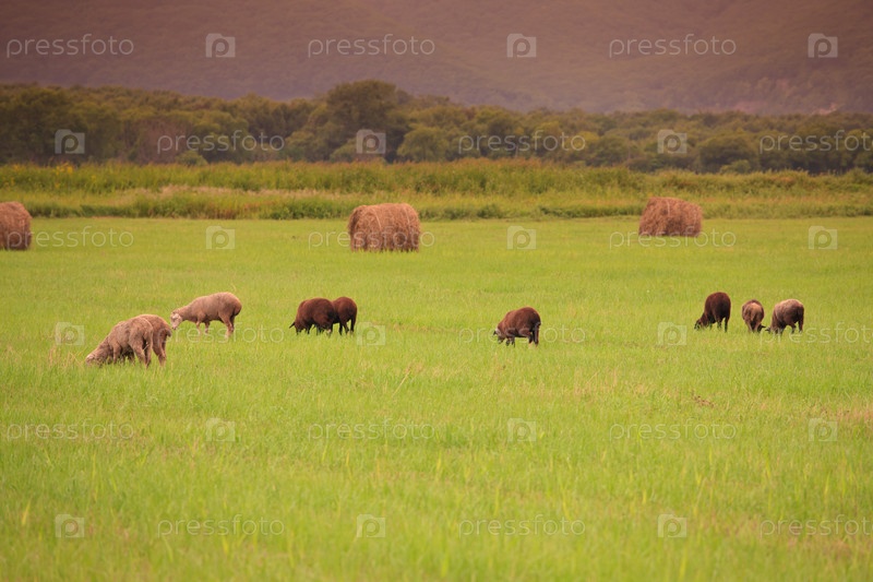 Стадо овец, пасущихся в поле среди стогов сена, на фоне гор