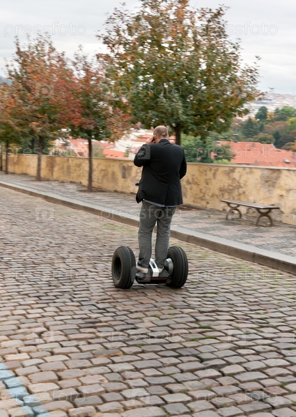 Человек едет на электрическом велосипеде по тротуару в Праге