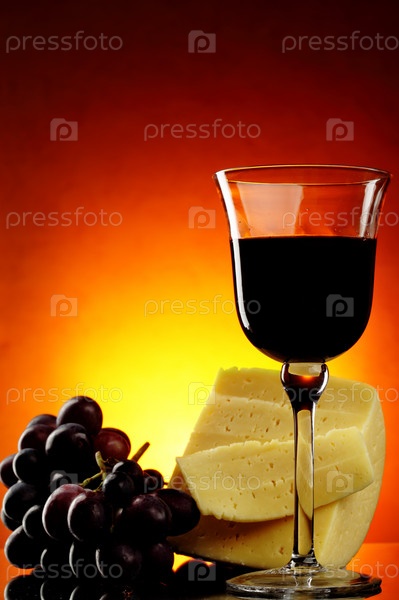 Бокал красного вина с виноградом и сыром