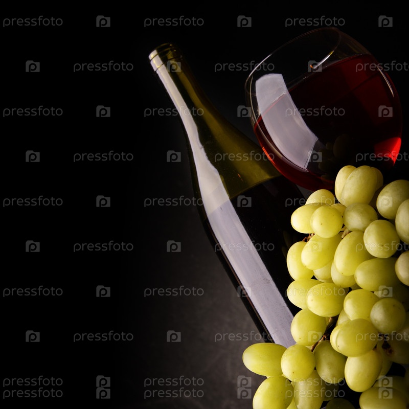 Бутылка и бокал красного вина с гроздью винограда