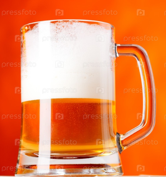 Кружка пива с пеной на оранжевом фоне