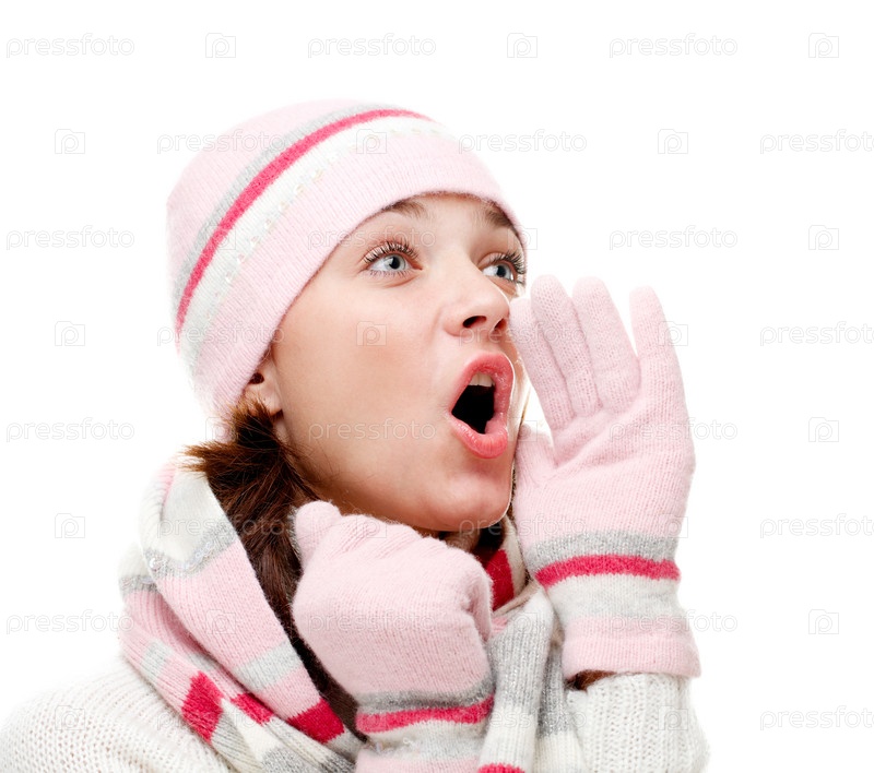 Возбужденная девушка в зимней одежде на белом фоне