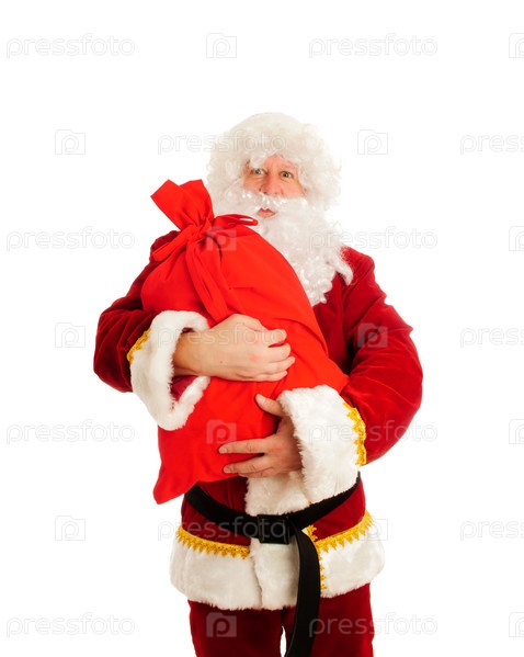 Дед Мороз с красным мешком на белом фоне