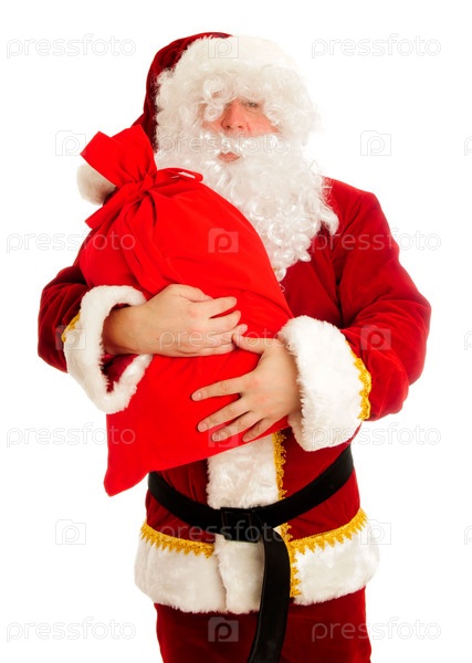 Дед Мороз с мешком подарков на белом фоне