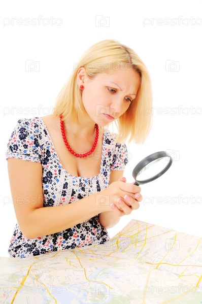 Привлекательная блондинка рассматривает карту с лупой