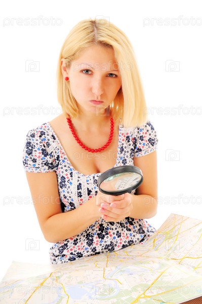 Привлекательная блондинка рассматривает карту с лупой