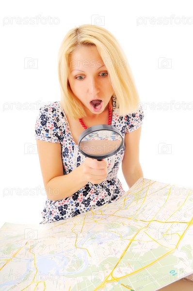 Привлекательная блондинка рассматривает карту с лупой