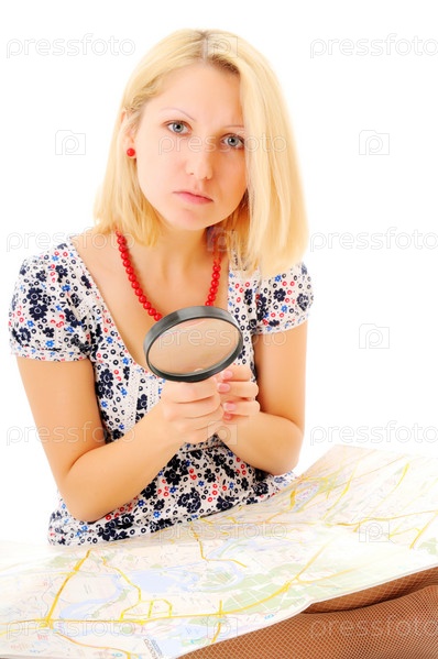 Привлекательная блондинка рассматривает карту с лупой
