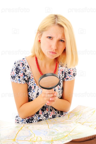 Привлекательная блондинка рассматривает карту с лупой