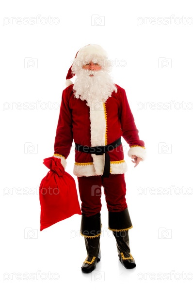 Санта-Клаус с мешком в руке на белом фоне
