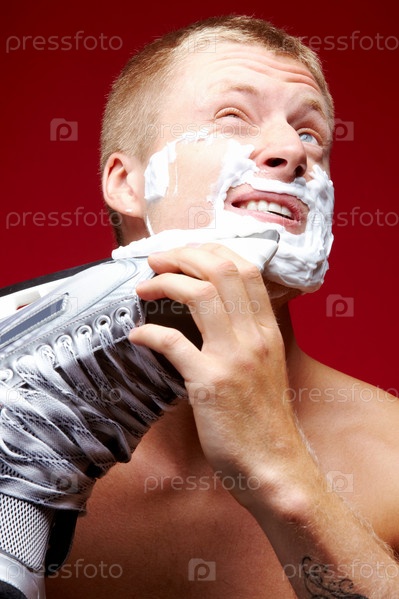 Мужчина бреется лезвием от коньков