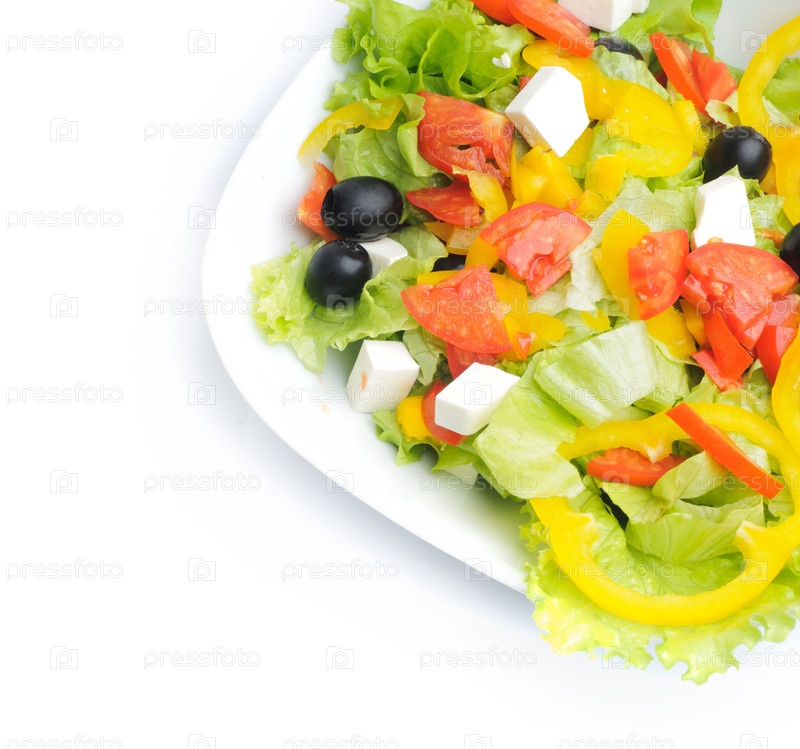 Греческий салат в тарелке на белом фоне