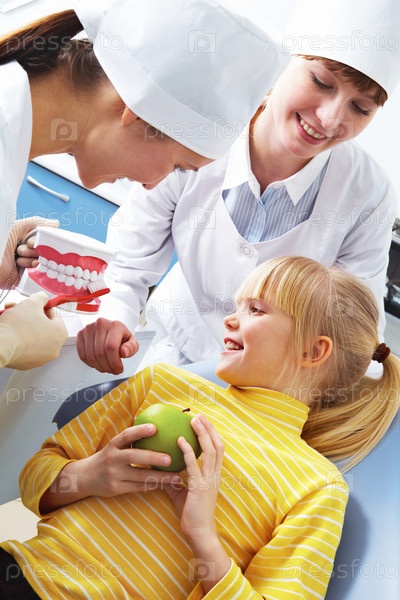 Стоматолог показывает маленькой пациентке как чистить зубы
