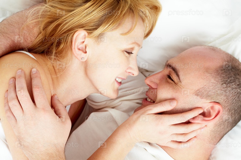 Счастливая семейная пара лежит в постели