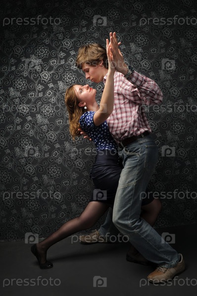 Пара танцоров на фоне черно-белых обоев