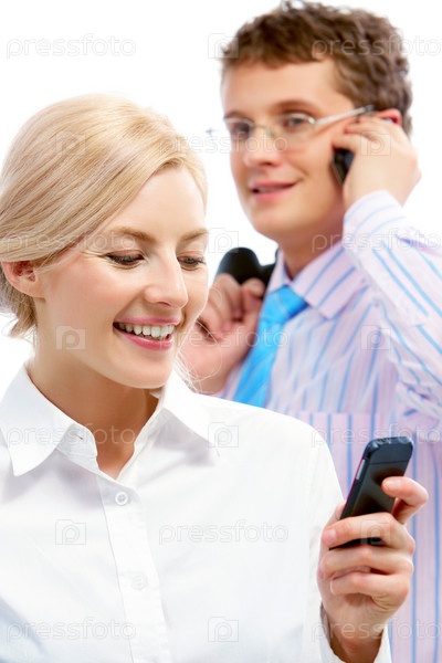 Деловые мужчина и женщина с мобильными телефонами на белом фоне