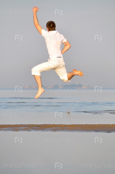 Молодой человек в белом прыгает на пляже утром