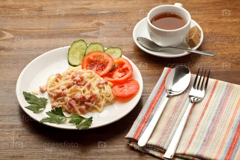 Спагетти карбонара и чай на деревянном столе