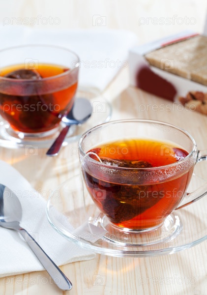 Две чашки чая из пакетиков и коробка сахара на деревянном столе