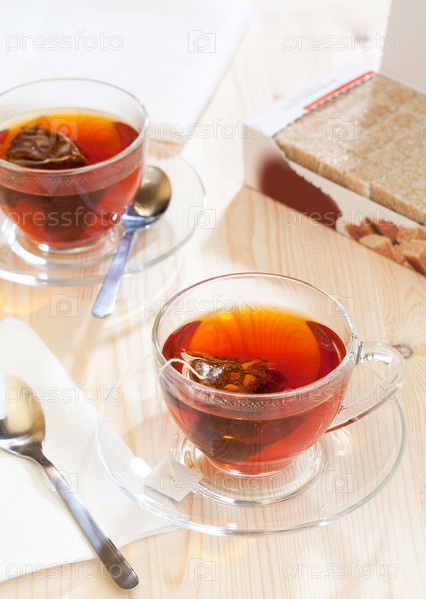 Две чашки чая из пакетиков и коробка сахара на деревянном столе
