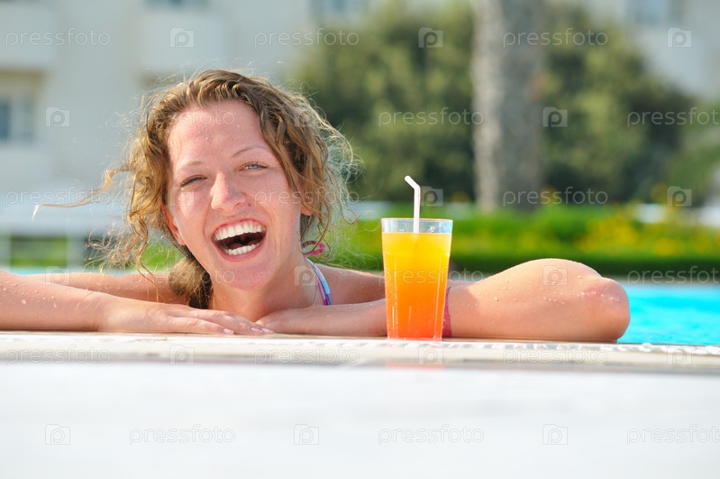 Смеющаяся девушка со стаканом сока в бассейне