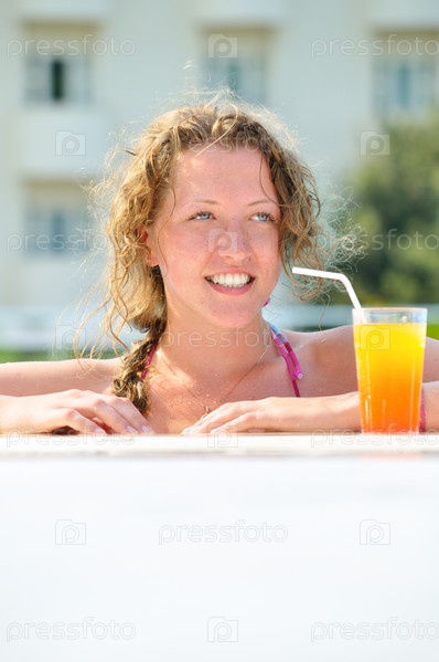Блондинка в бассейне со стаканом сока