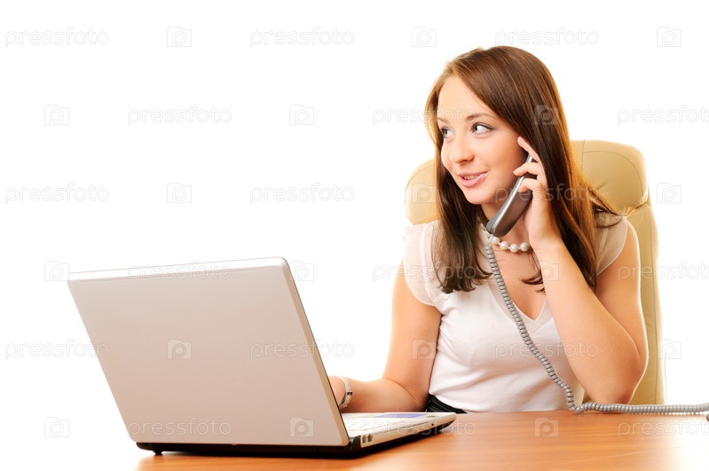 Девушка сидит за столом перед ноутбуком и говорит по телефону
