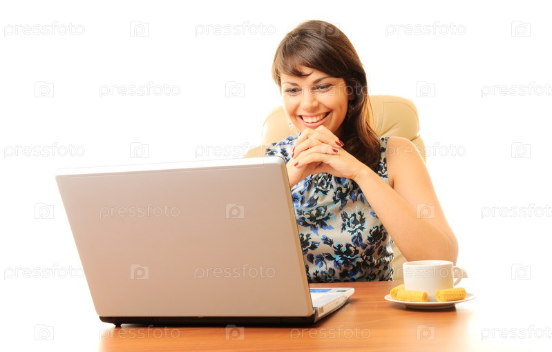 Девушка сидит за столом перед ноутбуком, чашка кофе с печеньем стоит рядом