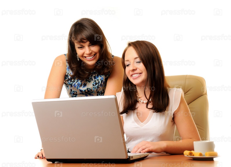 Две сотрудницы обсуждают рабочий вопрос за одним ноутбуком
