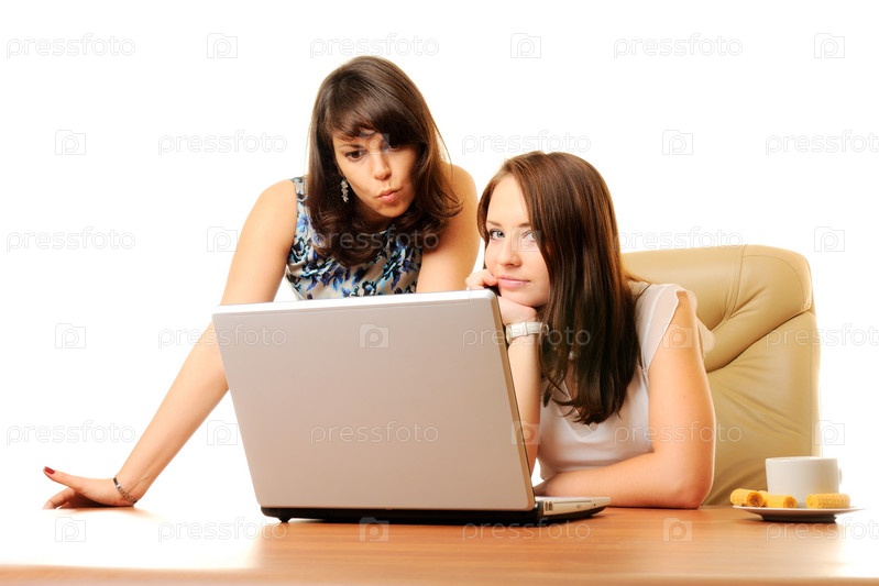 Две сотрудницы обсуждают рабочий вопрос за одним ноутбуком