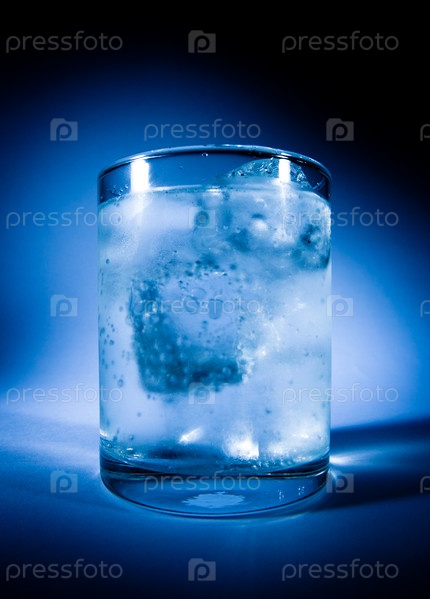 Запотевший стакан воды со льдом на темно-синем фоне