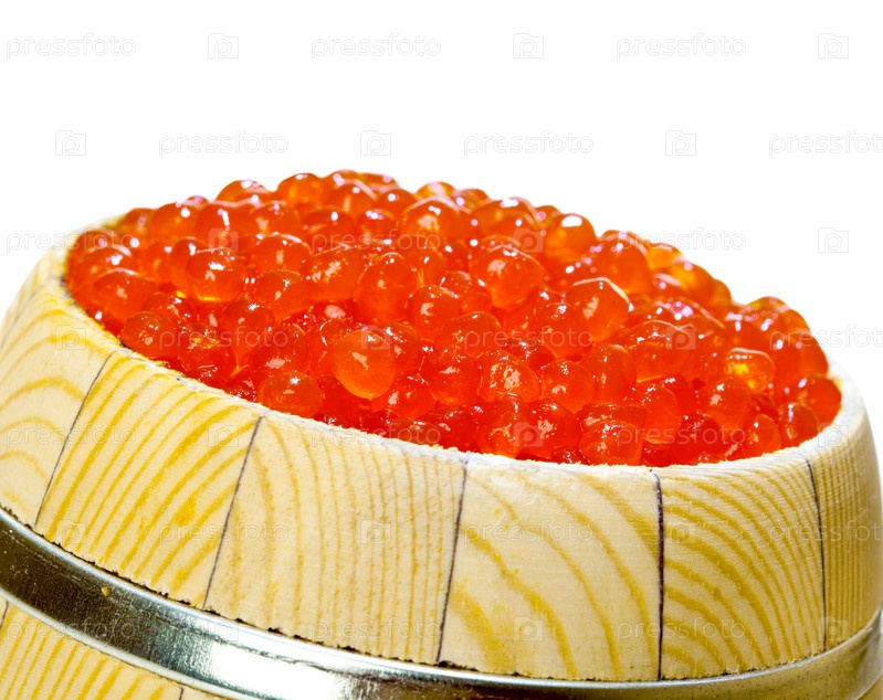 Бочонок красной икры на белом фоне