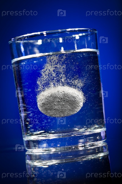 Шипучая таблетка в воде на синем фоне