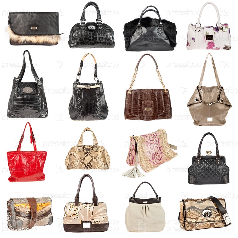Женские кожаные сумки на белом фоне, 16 штук