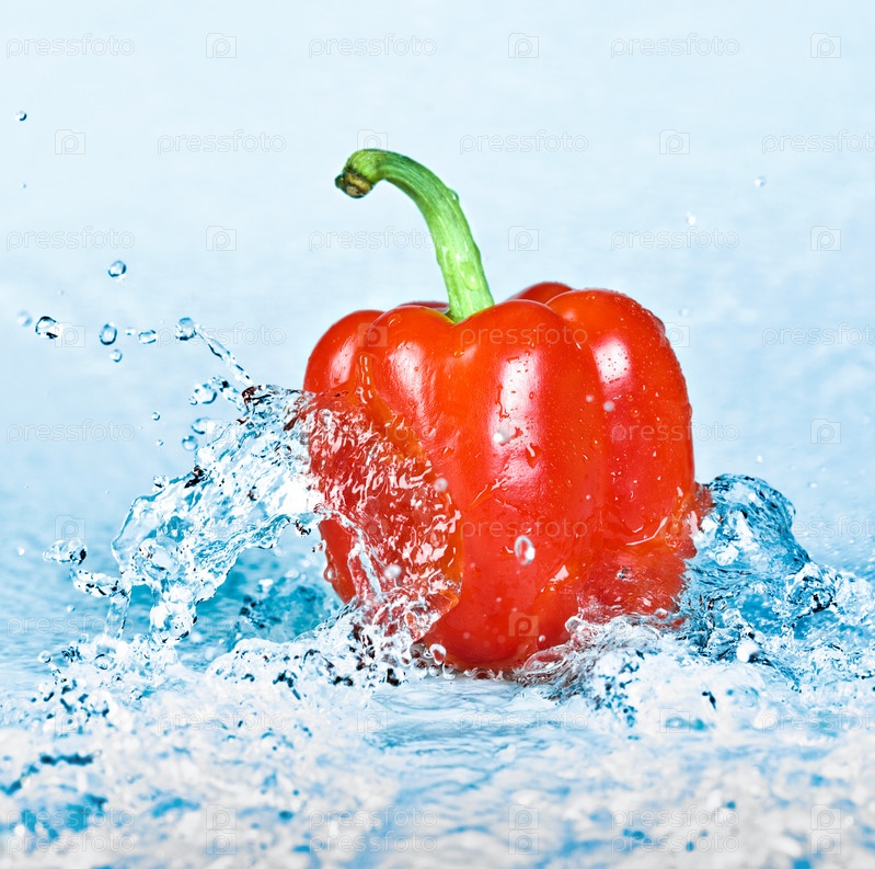 Красный болгарский перец в брызгах воды