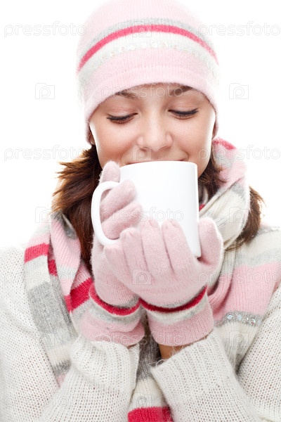 Девушка в теплой одежде с кружкой чая на белом фоне